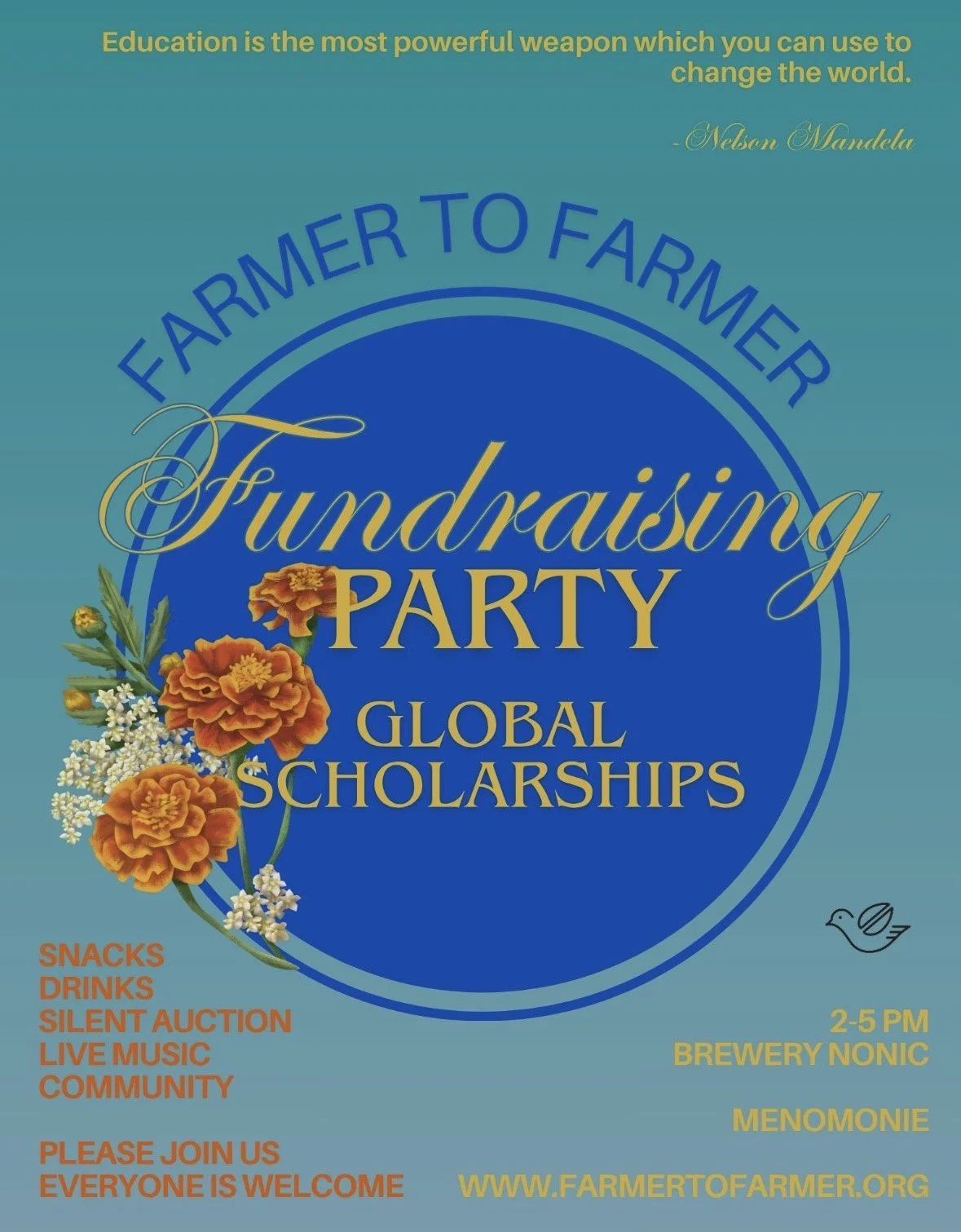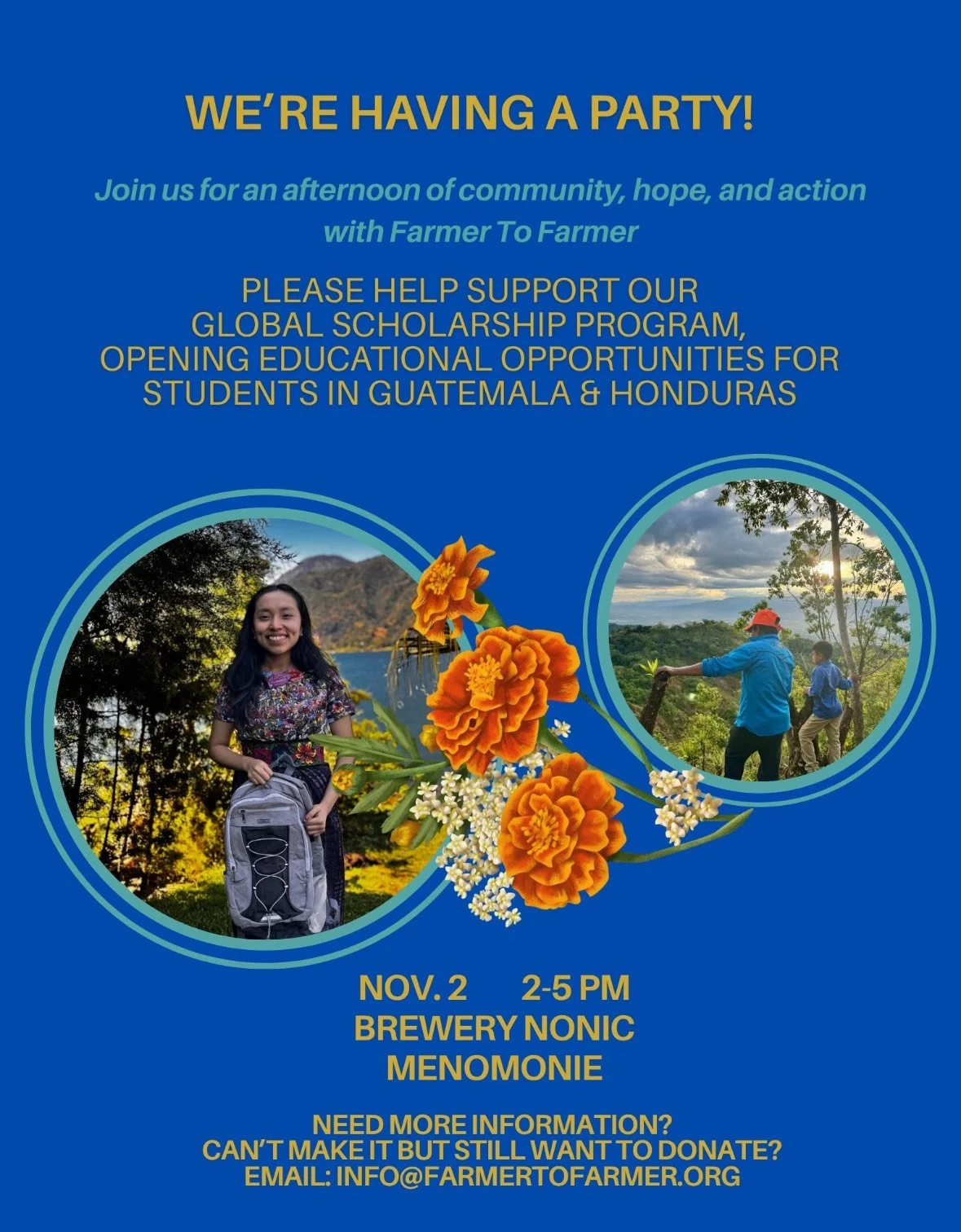 Join us on November 2nd, from 2 PM to 5 PM at Brewery Nonic in Menomonie, WI. There will be live music, a silent auction, and a raffle. Plus good company and opportunities to learn more about Farmer To Farmer and the Global Scholarship Program.